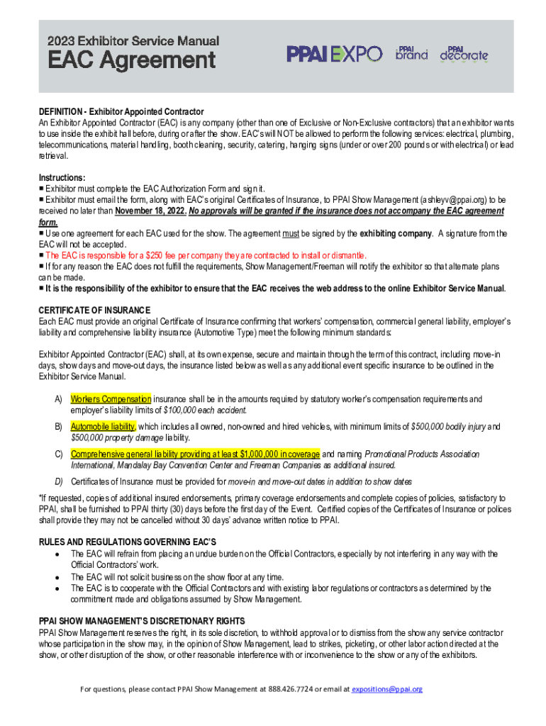An Exhibitor Appointed Contractor (EAC) is any company (other than one of Exclusive or NonExclusive contractors) that an exhibitor wants