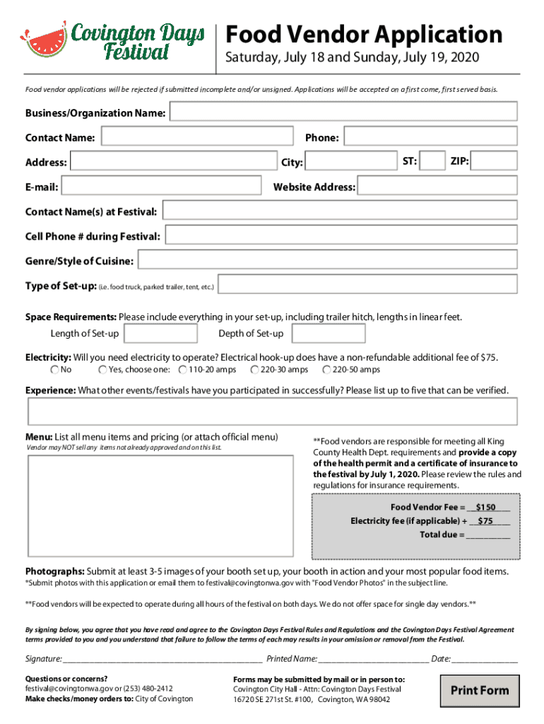 Food Vendor Application Saturday, July 18 and Sunday, July 19, 2020Food vendor applications will be rejected if submitted incomplete and/or unsigned. Applications will be accepted on a first come,