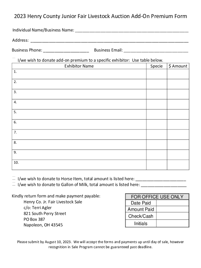 2023 Henry County Junior Fair Livestock Auction AddOn Premium Form Individual Name/Business Name: ___ Address: ___ Business Phone: ___Business Email: ___I/we wish to donate addon premium to a specific