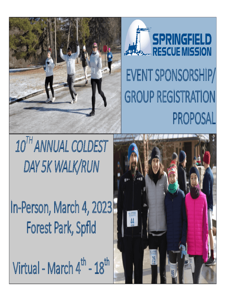 EVENT SPONSORSHIP/ GROUP REGISTRATION PROPOSAL TH10 ANNUAL COLDEST DAY 5K WALK/RUN InPerson, March 4, 2023 Forest Park, Spfld ththVirtual March 4 18SPRINGFIELD RESCUE MISSIONS COLDEST DAY 5K WALK/RUN