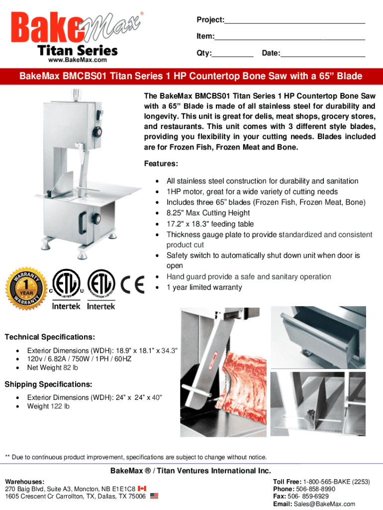 Project:___ Item:___ Qty:___Date:___BakeMax BMCBS01 Titan Series 1 HP Countertop Bone Saw with a 65 Blade The BakeMax BMCBS01 Titan Series 1 HP Countertop Bone Saw with a 65 Blade is made of all stainless