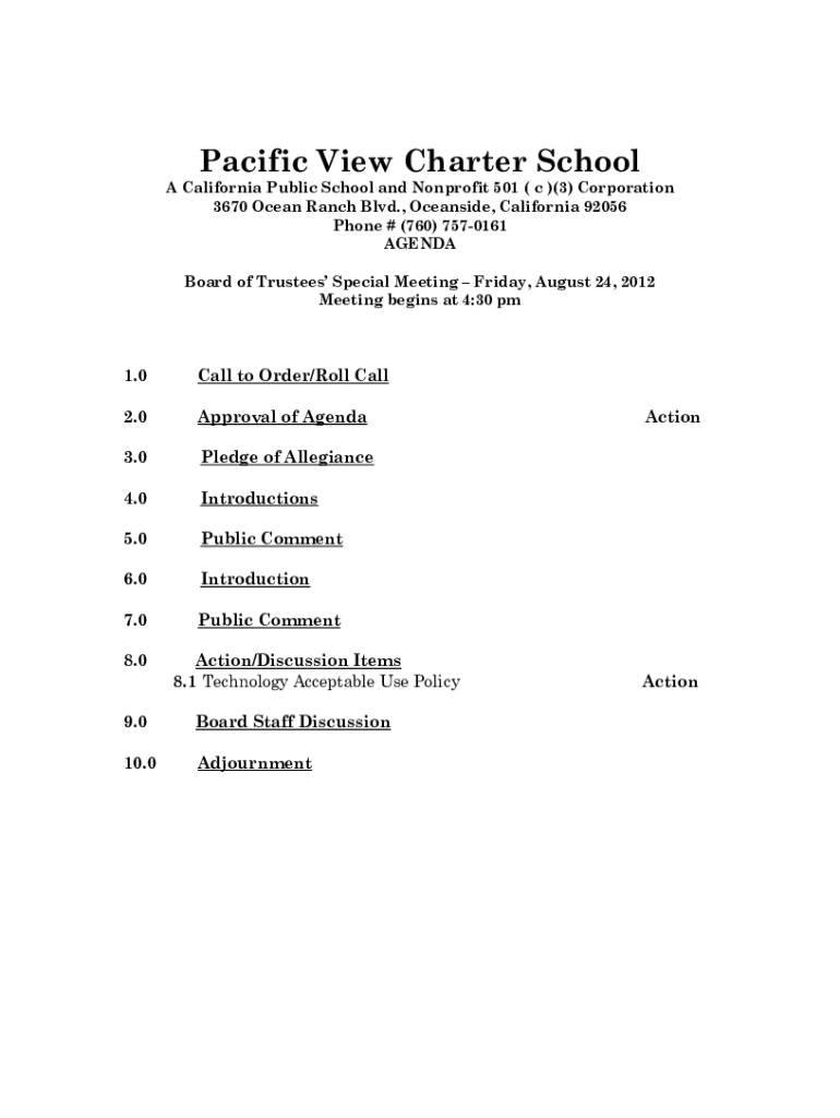 Pacific View Charter School A California Public School and Nonprofit 501 ( c )(3) Corporation 3670 Ocean Ranch Blvd., Oceanside, California 92056 Phone # (760) 7570161 AGENDA Board of Trustees Special