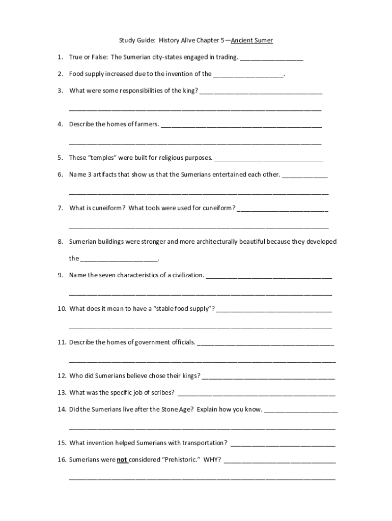 Study Guide: History Alive Chapter 5Ancient Sumer 1. True or False: The Sumerian citystates engaged in trading. ___ 2. Food supply increased due to the invention of the ___. 3. What were some responsibilities