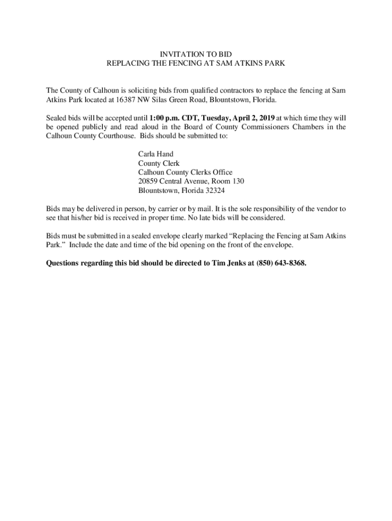 INVITATION TO BID REPLACING THE FENCING AT SAM ATKINS PARKThe County of Calhoun is soliciting bids from qualified contractors to replace the fencing at Sam Atkins Park located at 16387 NW Silas Green
