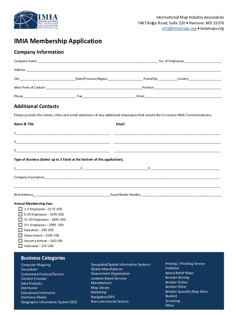 International Map Industry Association 7467 Ridge Road, Suite 220 Hanover, MD 21076 info@imiamaps.org imiamaps.orgIMIA Membership Application Company Information Company Name ___ No. of Employees___