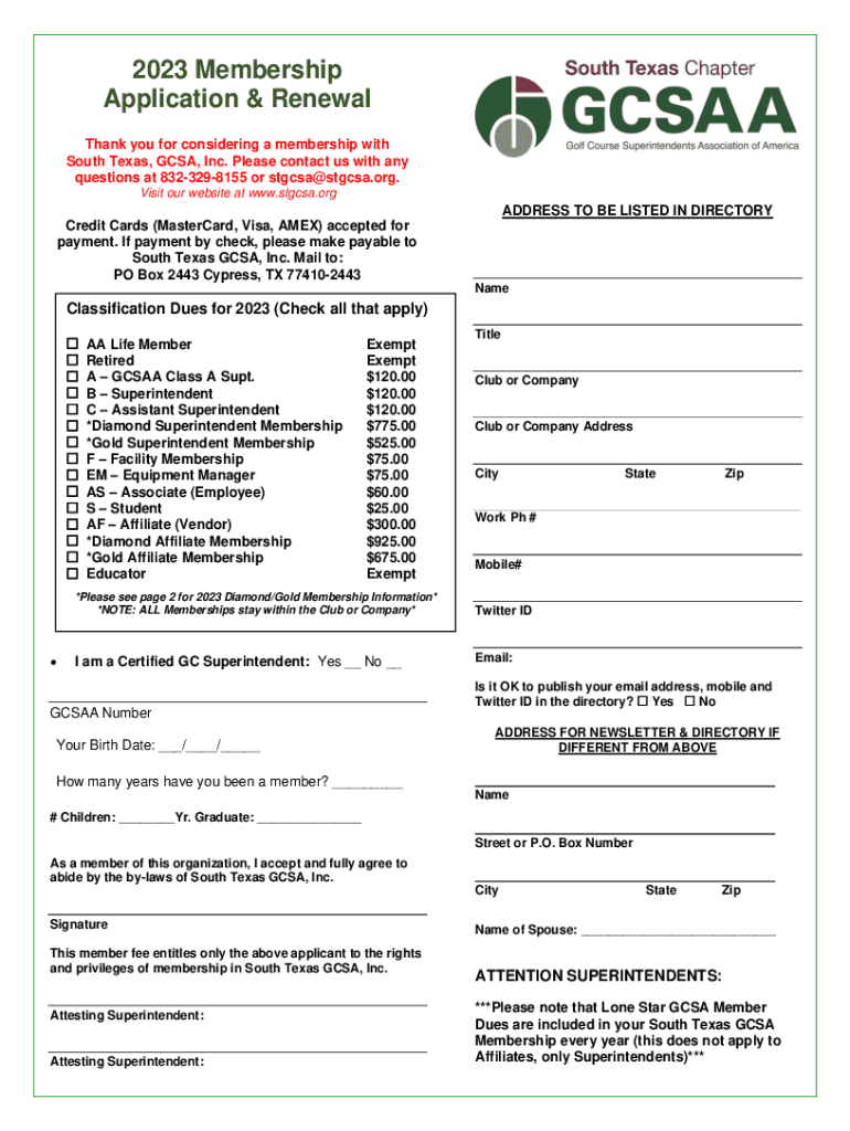 2023 Membership Application & Renewal Thank you for considering a membership with South Texas, GCSA, Inc. Please contact us with any questions at 8323298155 or stgcsa@stgcsa.org. Visit our website