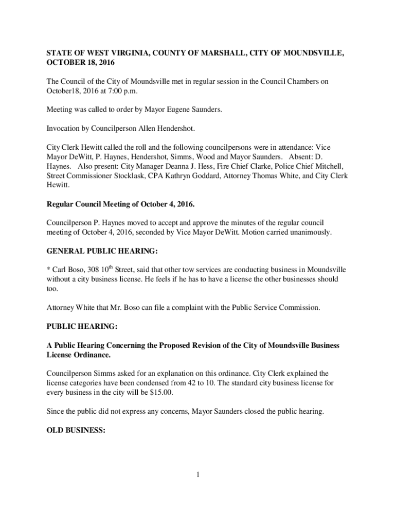 STATE OF WEST VIRGINIA, COUNTY OF MARSHALL, CITY OF MOUNDSVILLE, OCTOBER 18, 2016 The Council of the City of Moundsville met in regular session in the Council Chambers on October18, 2016 at 7:00 p.m.