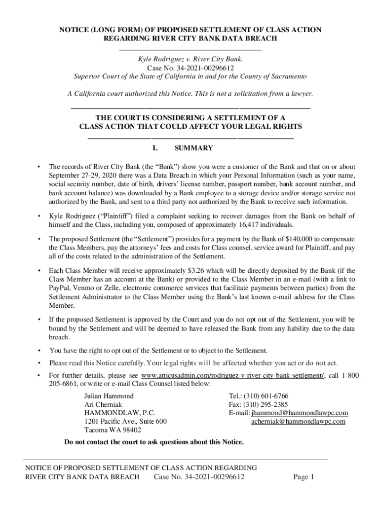 NOTICE (LONG FORM) OF PROPOSED SETTLEMENT OF CLASS ACTION REGARDING RIVER CITY BANK DATA BREACH ___ Kyle Rodriguez v. River City Bank. Case No. 34202100296612 Superior Court of the State of California