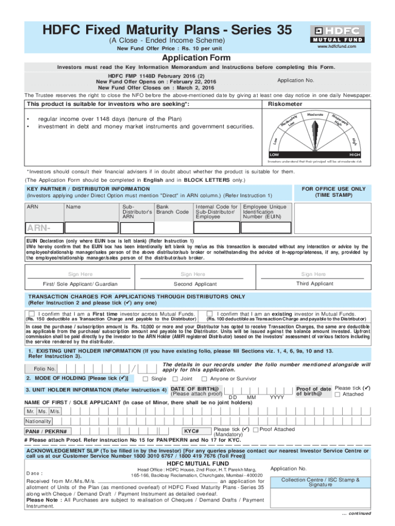 Key Information Memorandum & Application Form Investors must read the Key Information Memorandum and Instructions before completing this Form.HDFC Fixed Maturity Plans Series 35 (A Close Ended Income