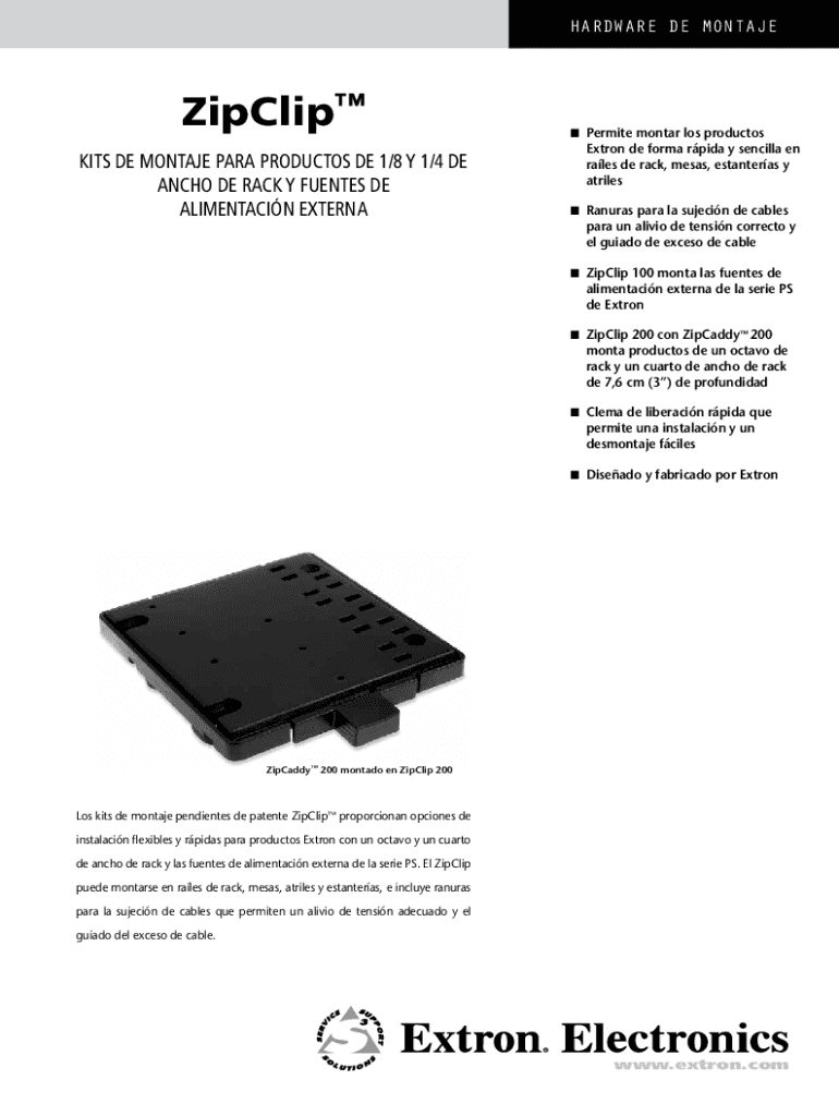 Hardware de montajeZipClip Kits de montaje para productos de 1/8 y 1/4 de ANCHO DE RACK y FUENTES DE ALIMENTACIN EXTERNAnPermite montar los productosExtron de forma rpida y sencilla en rales de rack,