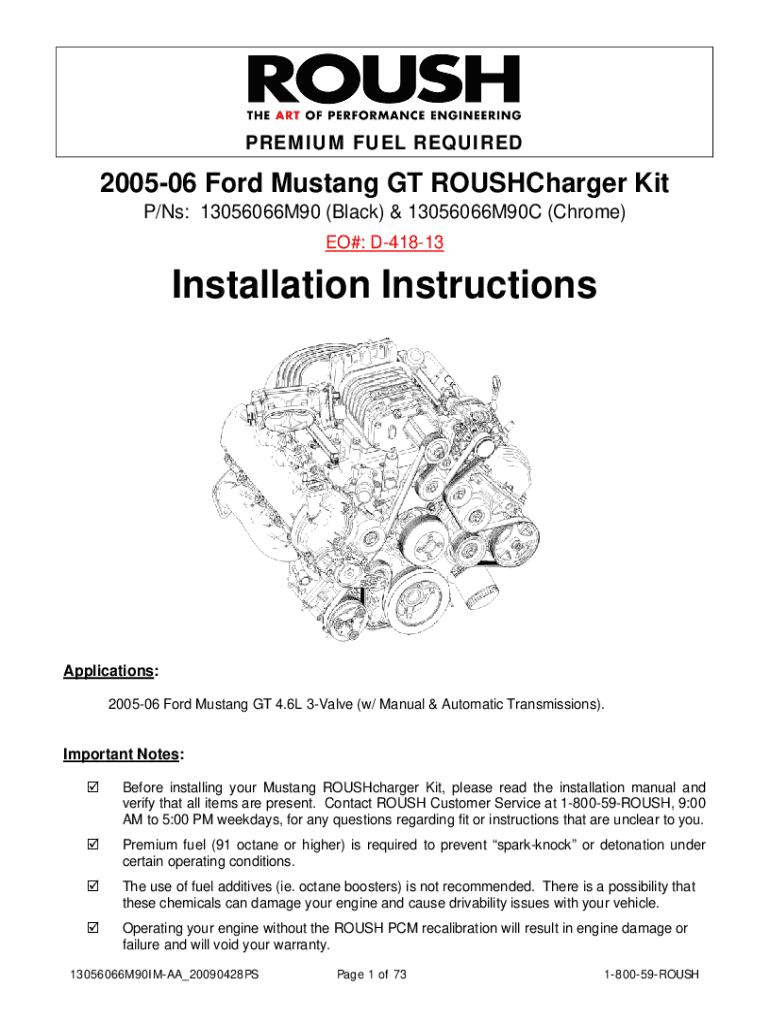 PREMIUM FUEL REQUIRED200506 Ford Mustang GT ROUSHCharger Kit P/Ns: 13056066M90 (Black) & 13056066M90C (Chrome) EO#: D41813Installation InstructionsApplications: 200506 Ford Mustang GT 4.6L 3Valve