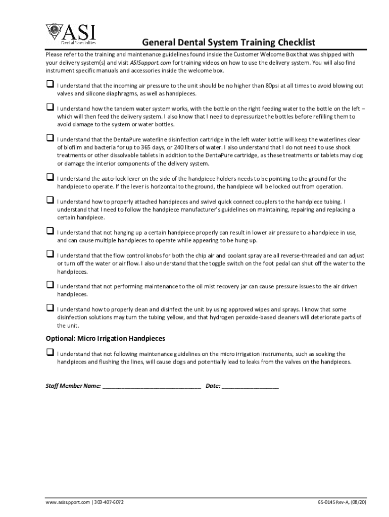 General Dental System Training Checklist Please refer to the training and maintenance guidelines found inside the Customer Welcome Box that was shipped with your delivery system(s) and visit ASISupport.com