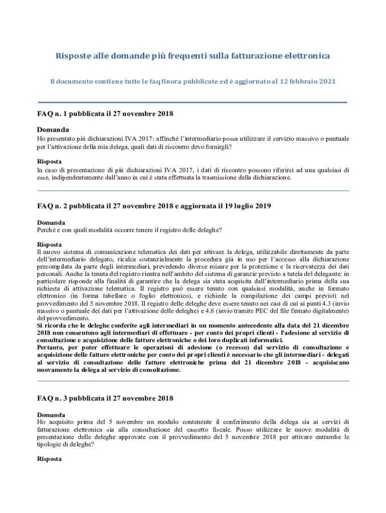 Risposte alle domande pi frequenti sulla fatturazione elettronica Il documento contiene tutte le faq finora pubblicate ed aggiornato al 12 febbraio 2021FAQ n. 1 pubblicata il 27 novembre 2018 Domanda