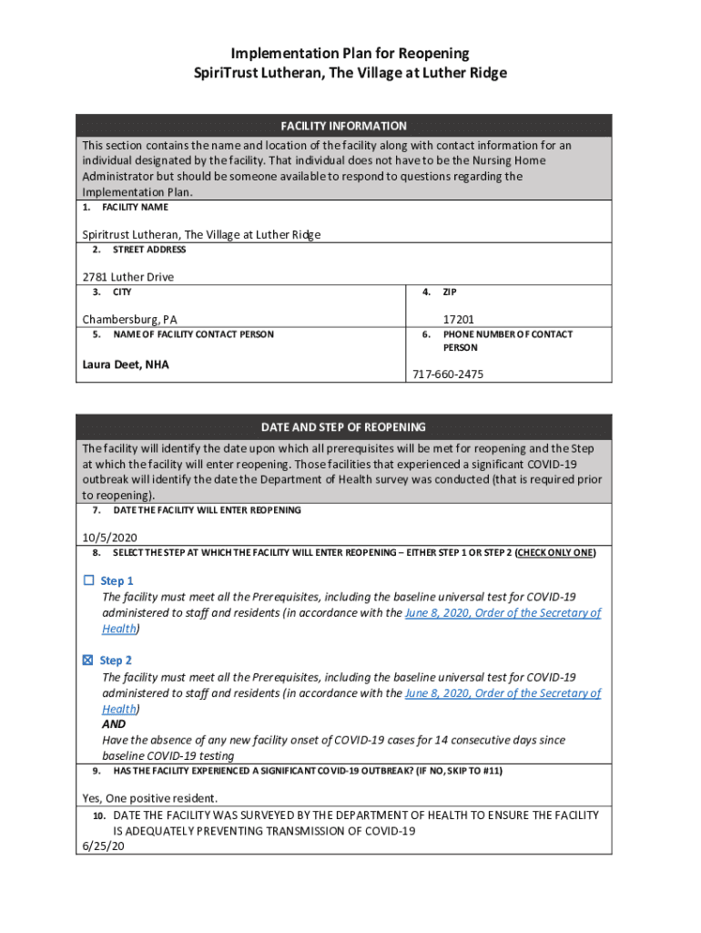 Implementation Plan for Reopening SpiriTrust Lutheran, The Village at Luther Ridge FACILITY INFORMATION This section contains the name and location of the facility along with contact information for