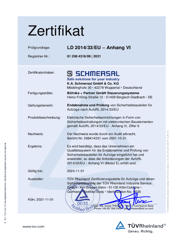 Prfgrundlage:LD 2014/33/EU Anhang VIRegisitrierNr.:01 208 4316/09 | 2021Zertifikatsinhaber:Fertigungssttte:Bhnke + Partner GmbH Steuerungssysteme