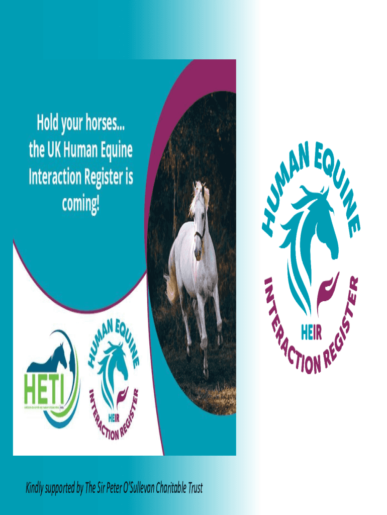Kindly supported by The Sir Peter OSullevan Charitable TrustVision The UK Human Equine Interaction Register (HEIR), supported by HETI, aims to bring together all people involved in the field of human