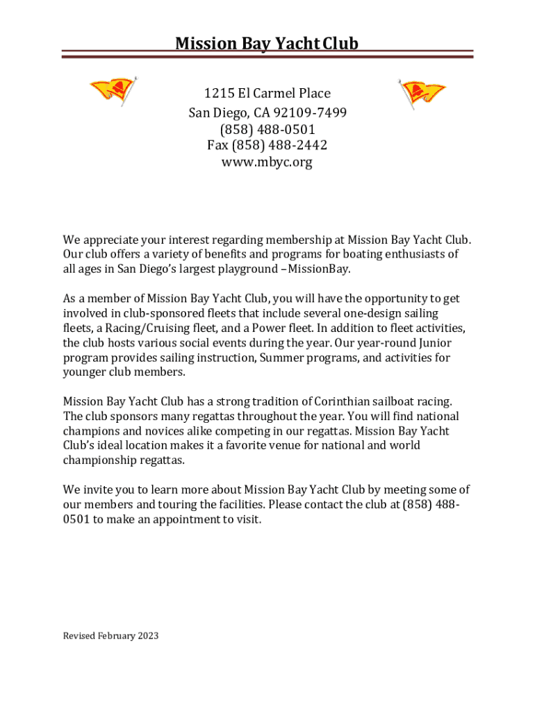 Mission Bay Yacht Club 1215 El Carmel Place San Diego, CA 921097499 (858) 4880501 Fax (858) 4882442 www.mbyc.orgWe appreciate your interest regarding membership at Mission Bay Yacht Club. Our club