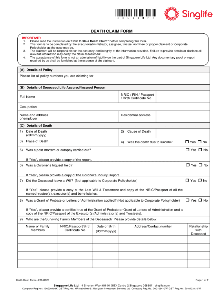 *CLAIMF* DEATH CLAIM FORM IMPORTANT: 1. Please read the instruction on How to file a Death Claim before completing this form. 2. This form is to be completed by the executor/administrator, assignee,