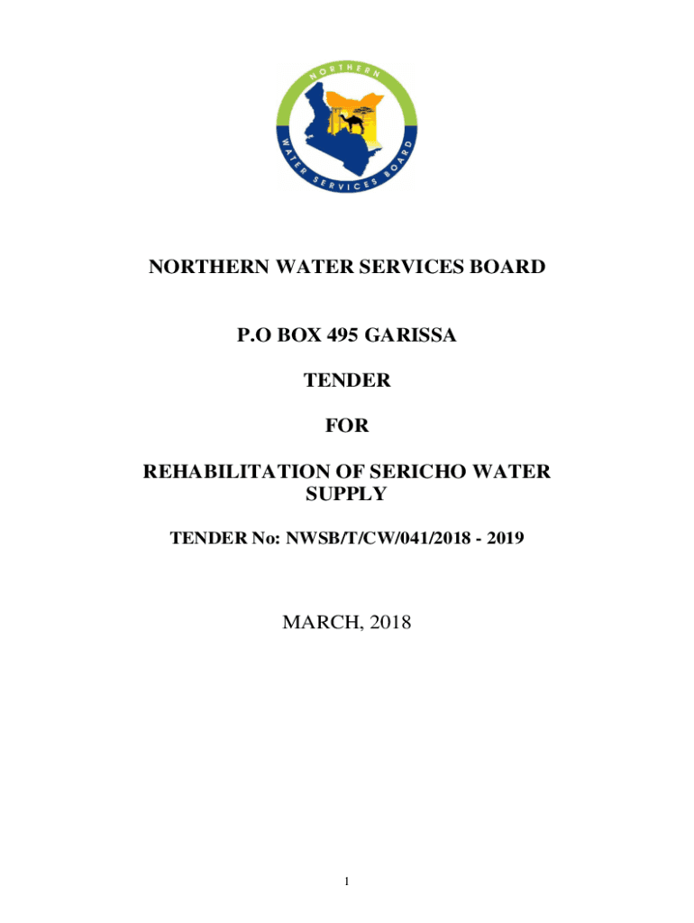 NORTHERN WATER SERVICES BOARDP.O BOX 495 GARISSA TENDER FOR REHABILITATION OF SERICHO WATER SUPPLY TENDER No: NWSB/T/CW/041/2018 2019MARCH, 20181TABLE OF CONTENTSSECTION II: INSTRUCTIONS TO TENDERER