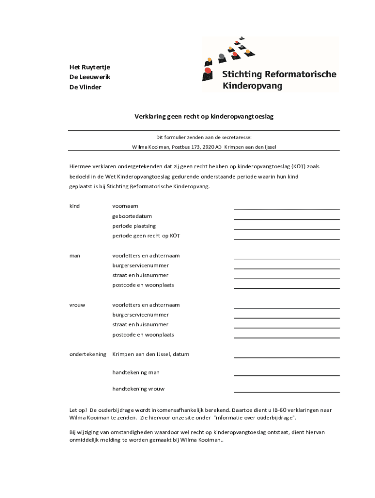 Het Ruytertje De Leeuwerik De VlinderVerklaring geen recht op kinderopvangtoeslag Dit formulier zenden aan de secretaresse: Wilma Kooiman, Postbus 173, 2920 AD Krimpen aan den IjsselHiermee verklaren