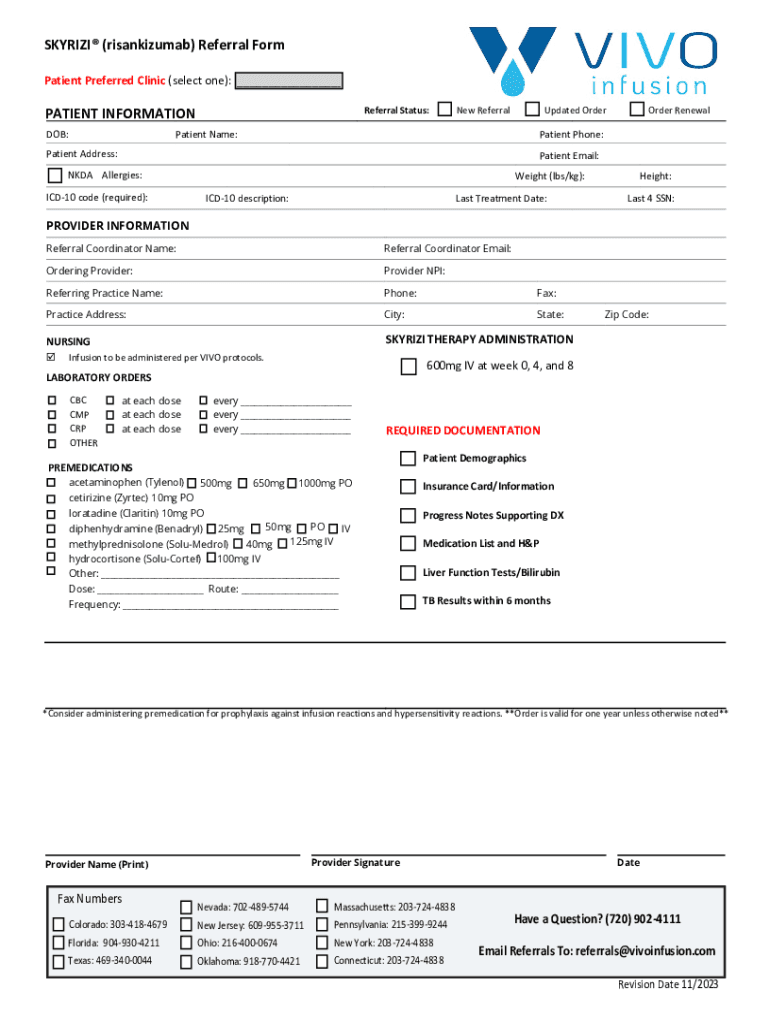 SKYRIZI (risankizumab) Referral Form Patient Preferred Clinic (select one): ___PATIENT INFORMATION DOB:Referral Status:New ReferralUpdated OrderPatient Name:Order RenewalPatient Phone:Patient Address:Patient