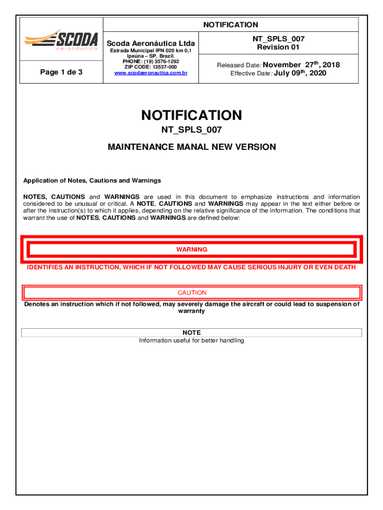 NOTIFICATION NT_SPLS_007 Revision 01Scoda Aeronutica LtdaPage 1 de 3Estrada Municipal IPN 020 km 0,1 Ipena SP, Brazil. PHONE: (19) 35761292 ZIP CODE: 13537000 www.scodaeronautica.com.brReleased Date: