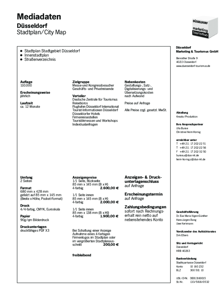 Mediadaten Dsseldorf Stadtplan/City Map Dsseldorf Marketing & Tourismus GmbHStadtplan Stadtgebiet Dsseldorf Innenstadtplan StraenverzeichnisAuage 110.000 Erscheinungsweise jhrlich Laufzeit ca. 12