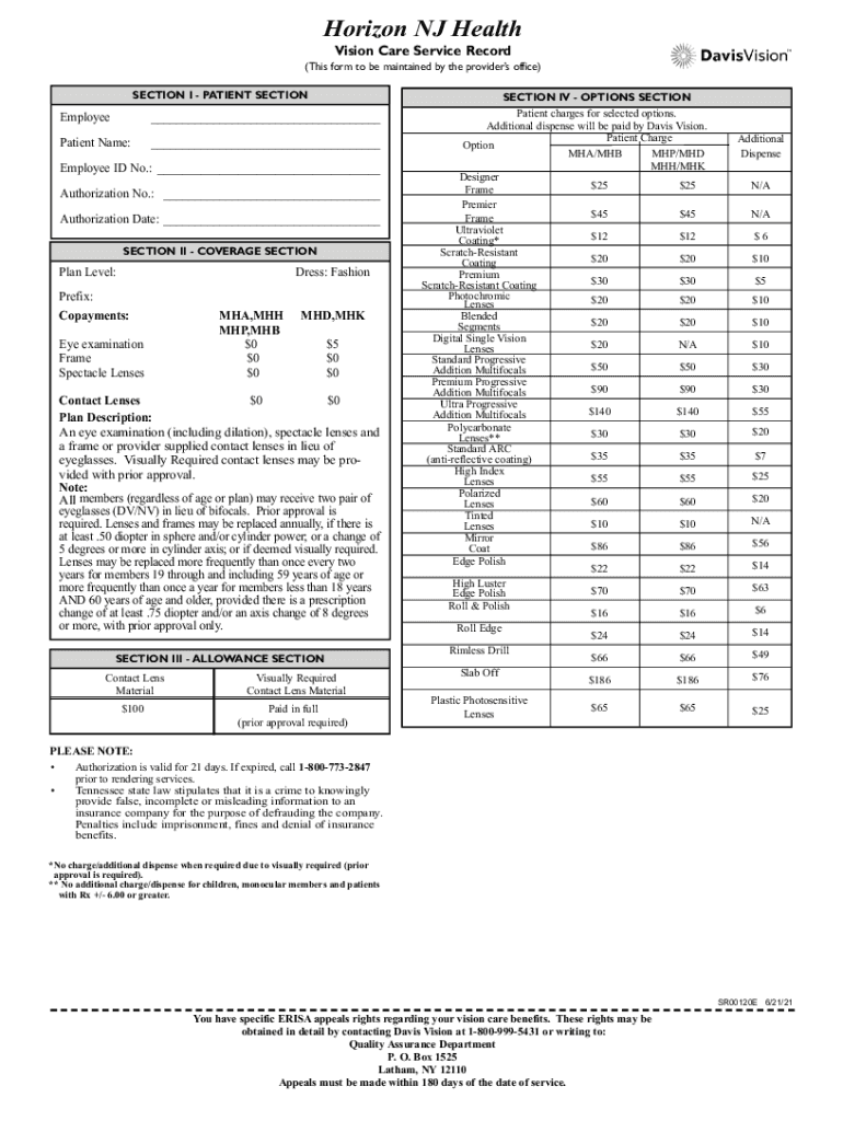 Horizon NJ Health Vision Care Service Record (This form to be maintained by the providers office) SECTION I PATIENT SECTIONEmployee___Patient Name:___Employee ID No.: ___ Authorization No.: ___ Authorization