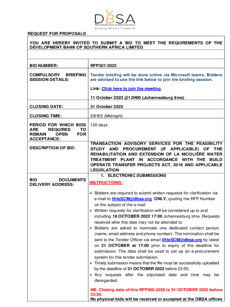REQUEST FOR PROPOSALS YOU ARE HEREBY INVITED TO SUBMIT A BID TO MEET THE REQUIREMENTS OF THE DEVELOPMENT BANK OF SOUTHERN AFRICA LIMITEDBID NUMBER:RFP301/2022COMPULSORY BRIEFING Tender briefing will