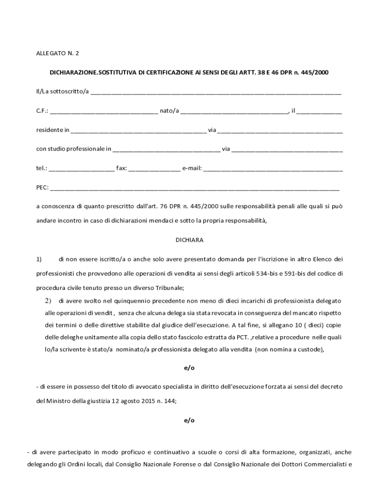 ALLEGATO N. 2 DICHIARAZIONE.SOSTITUTIVA DI CERTIFICAZIONE Al SENSI DEGLI ARTT. 38 E 46 DPR n. 445/2000 Il/La sottoscritto/a ___ C.F.: ___ nato/a ___, il ___ residente in ___ via ___ con studio professionale