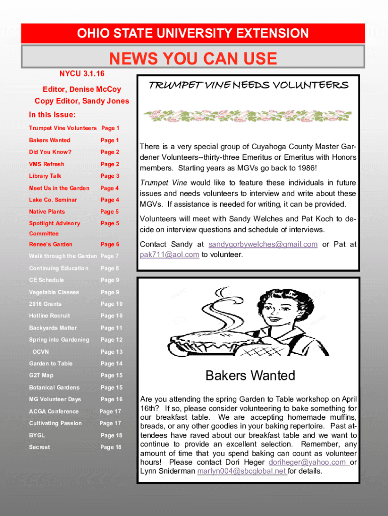Copy Editor, Sandy JonesTRUMPET VINE NEEDS VOLUNTEERS In this Issue:
