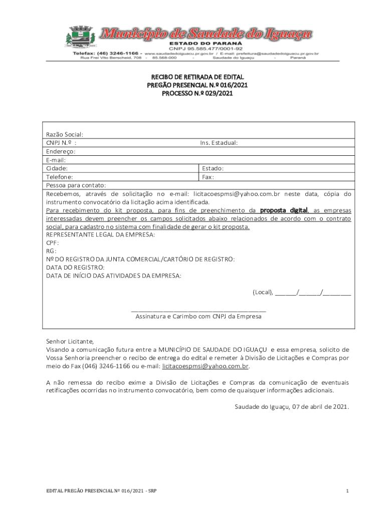 RECIBO DE RETIRADA DE EDITAL PREGO PRESENCIAL N. 016/2021 PROCESSO N. 029/2021Razo Social: CNPJ N. : Ins. Estadual: Endereo: Email: Cidade: Estado: Telefone: Fax: Pessoa para contato: Recebemos, atravs