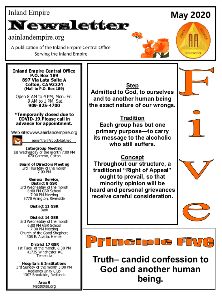 Inland EmpireNewsletterMay 2020aainlandempire.org A publication of the Inland Empire Central Office Serving the Inland Empire Inland Empire Central Office P.O. Box 189 897 Via Lata Suite A Colton,