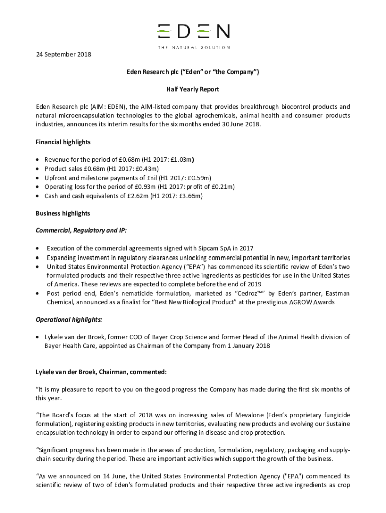 24 September 2018 Eden Research plc (Eden or the Company) Half Yearly Report Eden Research plc (AIM: EDEN), the AIMlisted company that provides breakthrough biocontrol products and natural microencapsulation