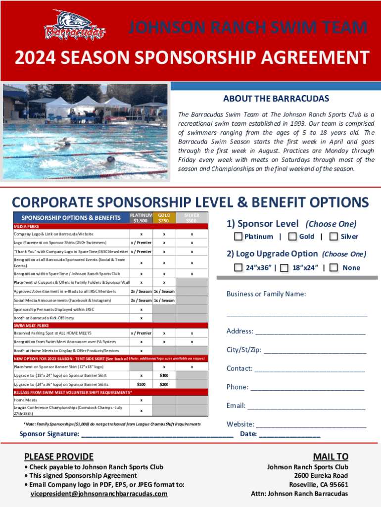 JOHNSON RANCH SWIM TEAM2024 SEASON SPONSORSHIP AGREEMENT ABOUT THE BARRACUDAS The Barracudas Swim Team at The Johnson Ranch Sports Club is a recreational swim team established in 1993. Our team is