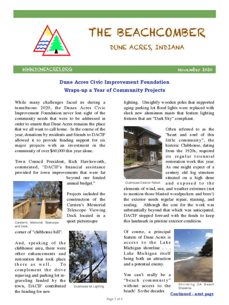 DUNE ACRES, INDIANAOctober, 2014WWW.DUNEACRES.ORGNovember 2020Dune Acres Civic Improvement Foundation Wrapsup a Year of Community Projects While many challenges faced us during a tumultuous 2020,
