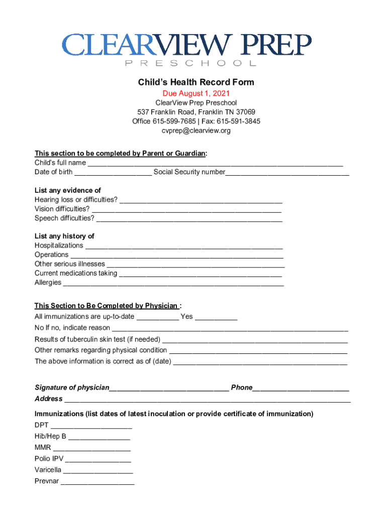 Childs Health Record Form Due August 1, 2021ClearView Prep Preschool 537 Franklin Road, Franklin TN 37069 Office 6155997685 | Fax: 6155913845 cvprep@clearview.orgThis section to be completed by Parent