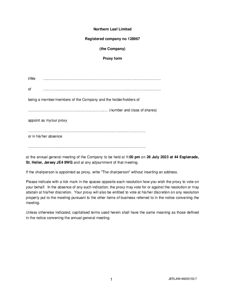 Northern Leaf Limited Registered company no 128967 (the Company) Proxy formI/Weofbeing a member/members of the Company and the holder/holders of ... (number and class of shares) appoint as my/our