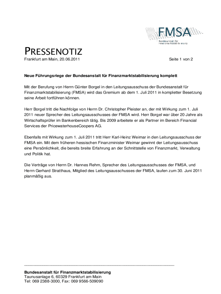 PRESSENOTIZ Frankfurt am Main, 20.06.2011Seite 1 von 2Neue Fhrungsriege der Bundesanstalt fr Finanzmarktstabilisierung komplett Mit der Berufung von Herrn Gnter Borgel in den Leitungsausschuss der