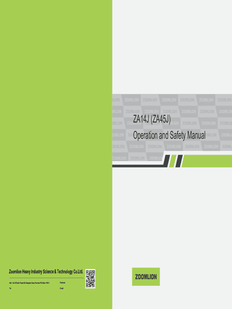 ZA14J (ZA45J) Operation and Safety ManualZoomlion Heavy Industry Science & Technology Co.Ltd. AddNo 361South Yinpen Rd Changsha Hunan Province P.R.China 410013Postcode:Tel:Email:Operation and Safety