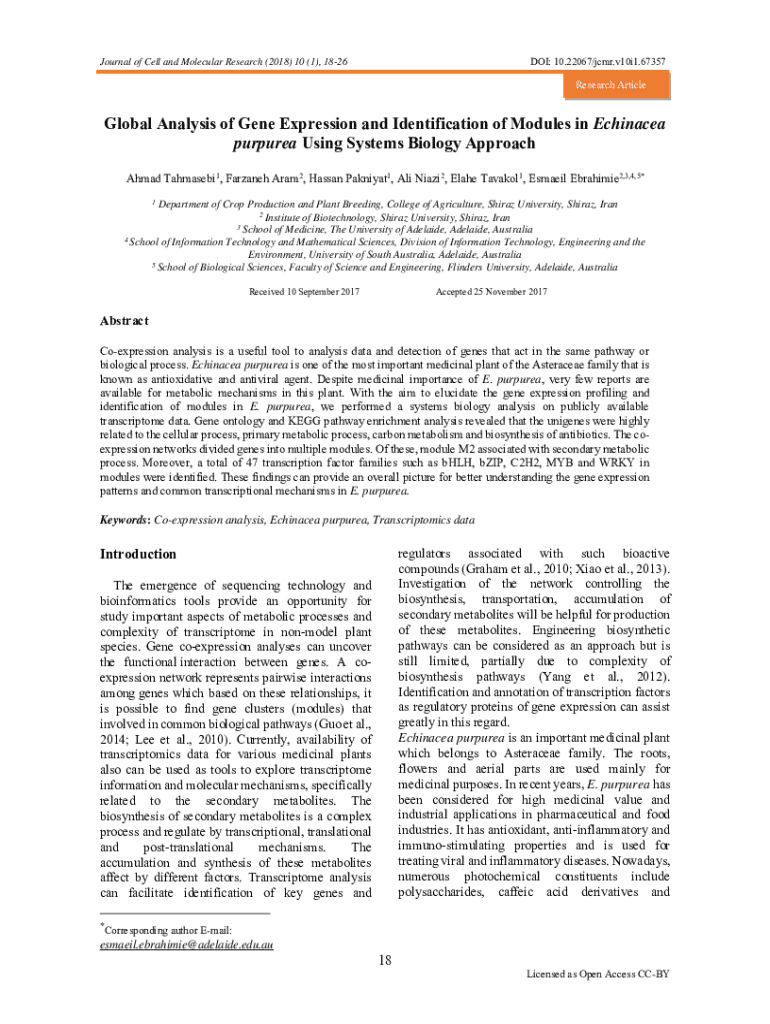 DOI: 10.22067/jcmr.v10i1.67357Journal of Cell and Molecular Research (2018) 10 (1), 1826Research ArticleGlobal Analysis of Gene Expression and Identification of Modules in Echinacea