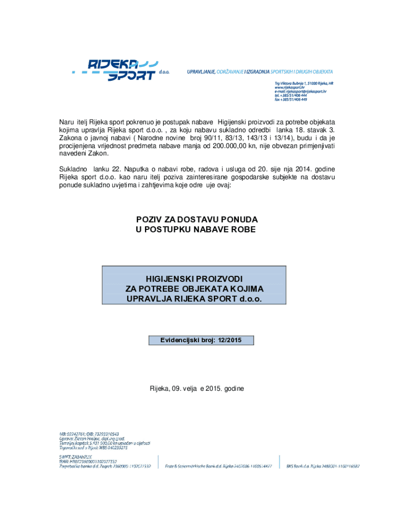 Get the free Naruitelj Rijeka sport pokrenuo je postupak nabave Higijenski proizvodi za potrebe o...