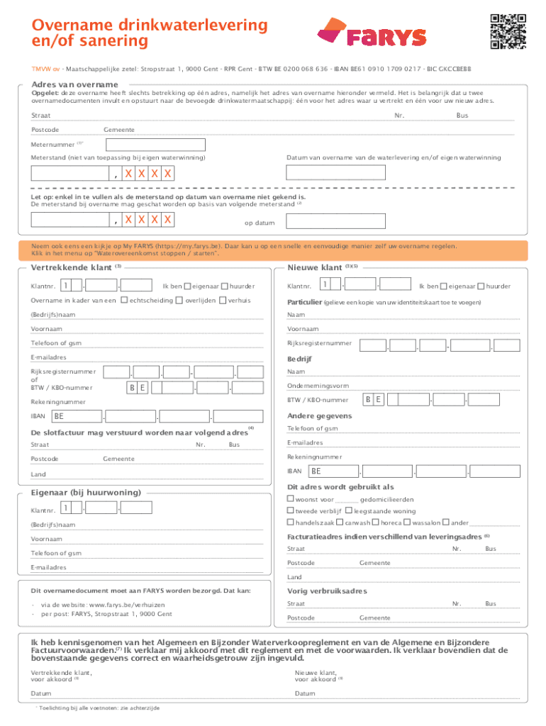 Overname drinkwaterlevering en/of sanering TMVW ov Maatschappelijke zetel: Stropstraat 1, 9000 Gent RPR Gent BTW BE 0200 068 636 IBAN BE61 0910 1709 0217 BIC GKCCBEBBAdres van overname Opgelet: deze
