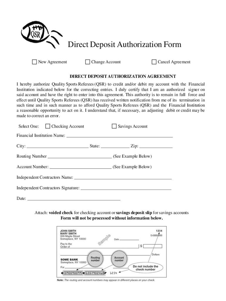 Direct Deposit Authorization Form New AgreementChange AccountCancel AgreementDIRECT DEPOSIT AUTHORIZATION AGREEMENT I hereby authorize Quality Sports Referees (QSR) to credit and/or debit my account