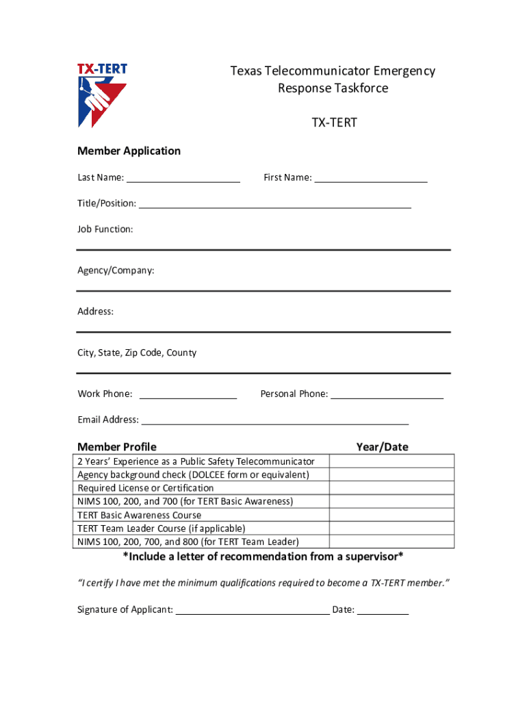 Texas Telecommunicator Emergency Response Taskforce TXTERT Member Application Last Name: ___First Name: ___Title/Position: ___ Job Function:Agency/Company:Address:City, State, Zip Code, CountyWork