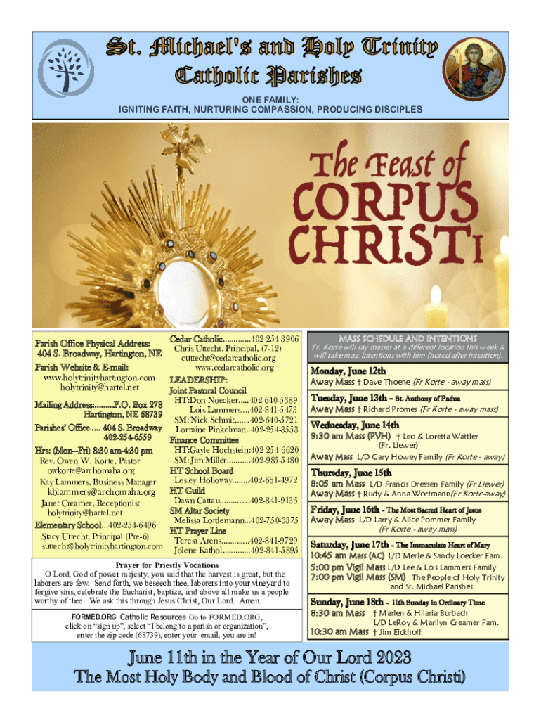 ONE FAMILY: IGNITING FAITH, NURTURING COMPASSION, PRODUCING DISCIPLESCedar Catholic.............4022543906 Parish Office Physical Address: Chris Uttecht, Principal, (712) 404 S. Broadway, Hartington,