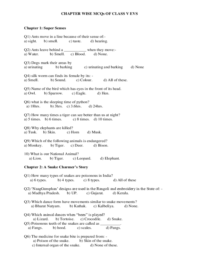 CHAPTER WISE MCQs OF CLASS V EVSChapter 1: Super Senses Q1) Ants move in a line because of their sense of:a) sight. b) smell. c) taste. d) hearing. Q2) Ants leave behind a ___ when they move:a) Water.
