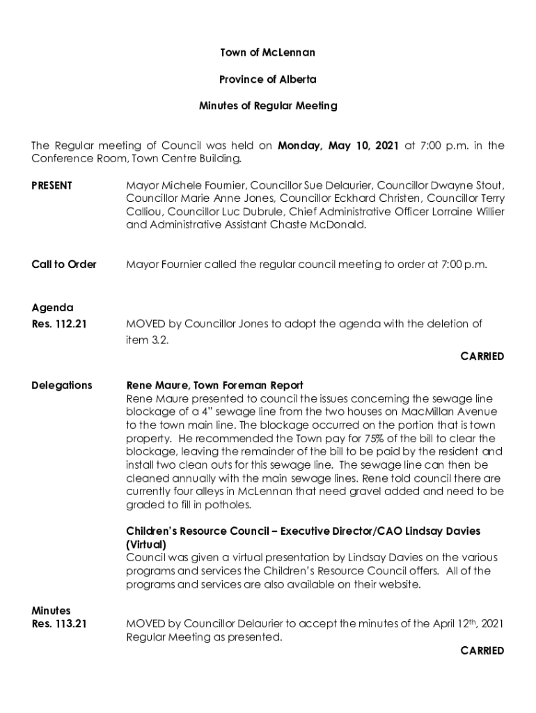 Town of McLennan Province of Alberta Minutes of Regular Meeting The Regular meeting of Council was held on Monday, May 10, 2021 at 7:00 p.m. in the Conference Room, Town Centre Building. PRESENTMayor