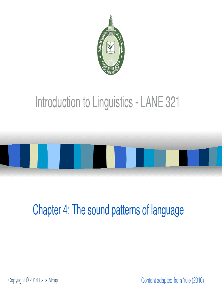 Introduction to Linguistics LANE 321 Chapter 4: The sound patterns of languageCopyright 2014 Haifa AlroqiContent adapted from Yule (2010)Phonetics vs. PhonologyPhonetics The study of of how speech