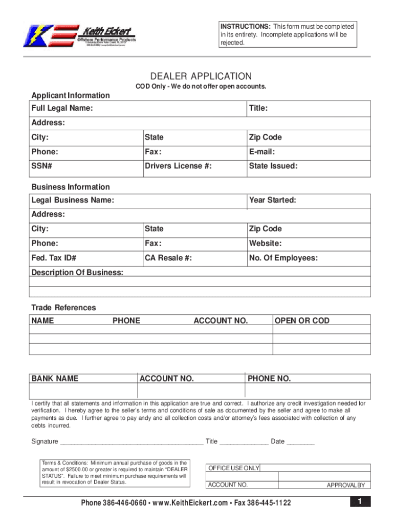 INSTRUCTIONS: This form must be completed in its entirety. Incomplete applications will be rejected.DEALER APPLICATION COD Only We do not offer open accounts.Applicant Information Full Legal Name:Title:Address: